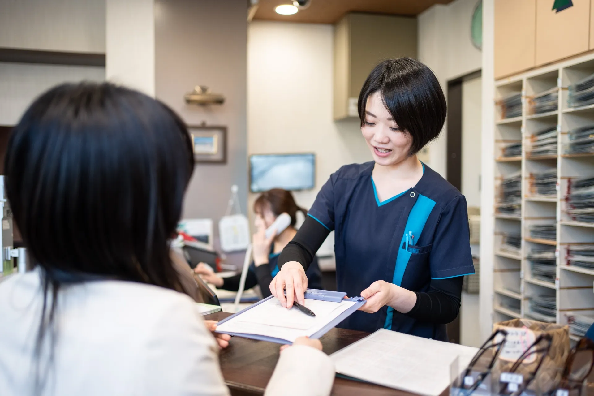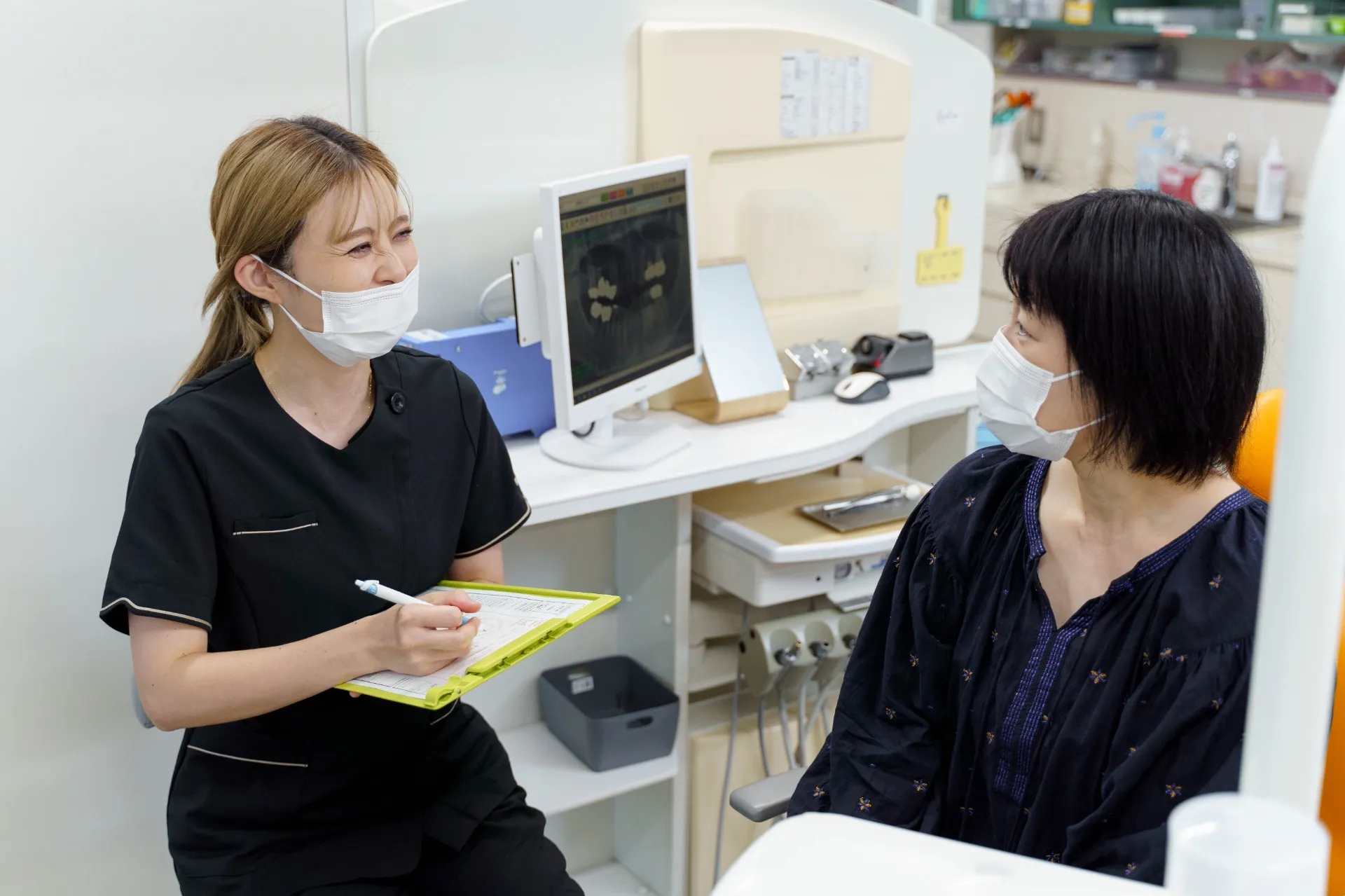 初診時はしっかりとお口の中の検査をおこないます。患者様のお口元の状態により、目安の時間よりも診察時間が長くなることもございます。また、問診票をご記入いただくため、ご予約時間の15分ほど前に余裕を持ってのご来院をお願いします。